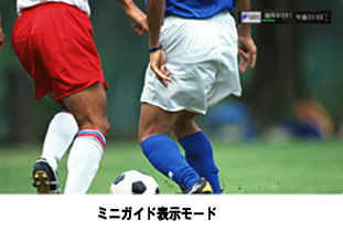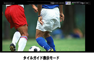 「画面表示」キーを押すことで、この画面表示モードを切り替えることができます。まず1回「画面表示」キーを押すと、[番組情報バー]を小さくすることができます。(「ミニガイド表示モード」)[下図@] さらにもう1回「画面表示」キーを押すと、「タイルガイド表示モード」[下図A]になります。これは[番組情報バー]やアイコンがメイン画面の上に重ならないようにメイン画面を避けてタイル表示されますので、スポーツ放送などで放送画面中にいろいろな情報が表示されている場合に便利です。